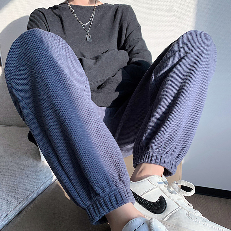 高端华夫格卫裤女春秋宽松休闲款美式蓝色运动裤束脚休闲九分裤热门设计联盟服务商
