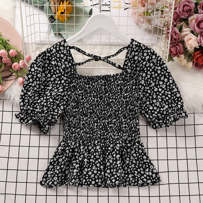 碎花雪纺衫女短袖2021夏装新款收腰设计感泡泡袖露肩高腰短款上衣热门设计联盟服务商
