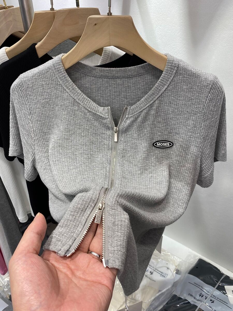 欧货设计感小众双拉链螺纹显瘦短袖T恤女2021夏新款高腰短款上衣热门设计联盟服务商