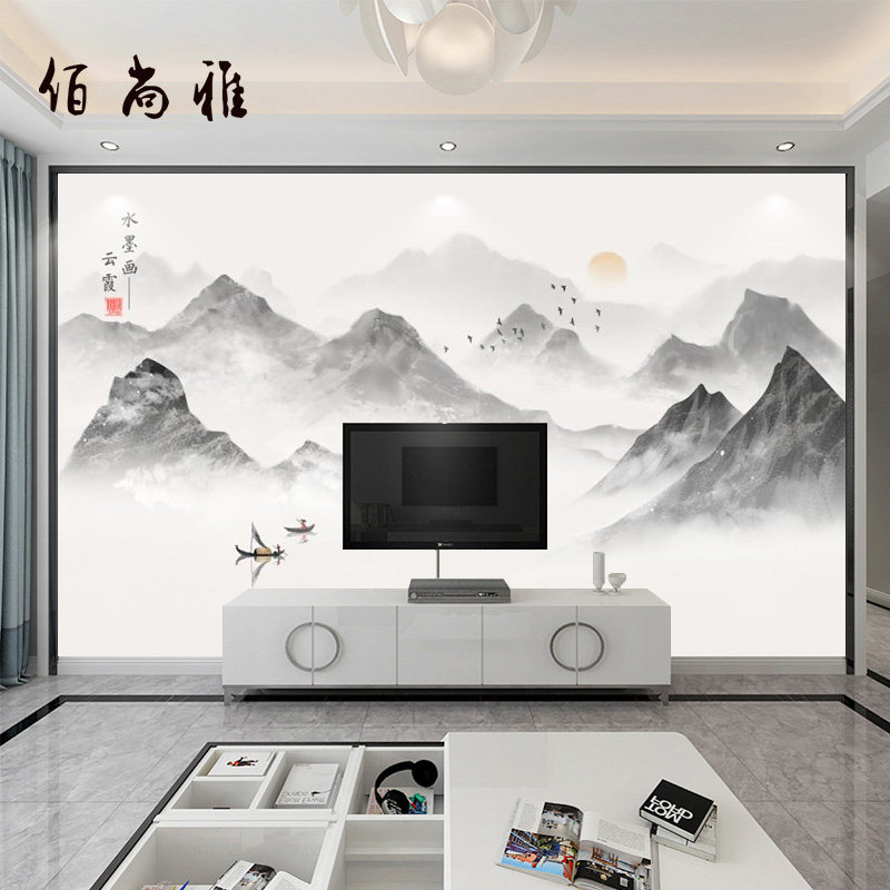 壁画2022新款轻奢新中式电视背景墙壁纸意境山水画影视墙壁布墙纸热门设计联盟服务商