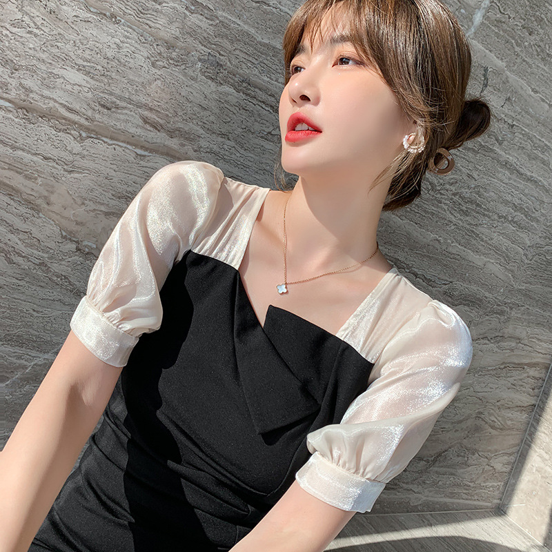 坚果服饰法式复古泡泡袖小黑裙2021夏季新款小众设计感性感开叉裙热门设计联盟服务商