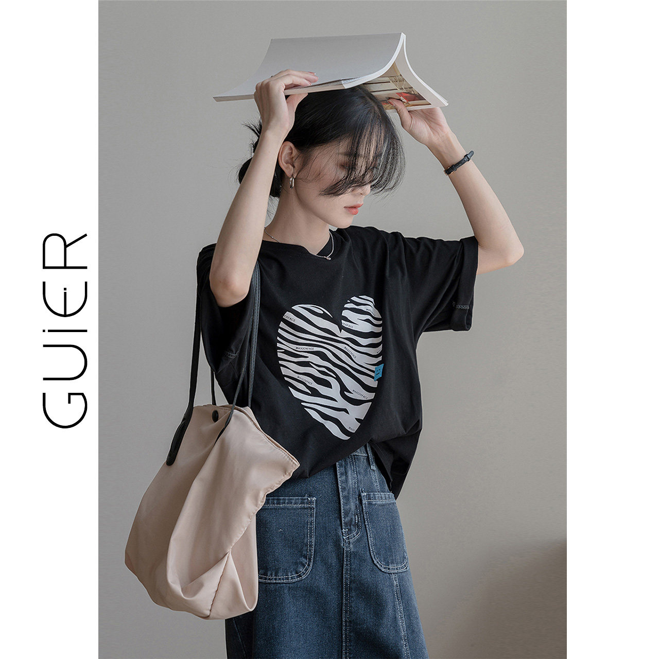 「GUIER」短袖t恤女2021年新款夏季设计感小众黑色韩系宽松上衣女热门设计联盟服务商