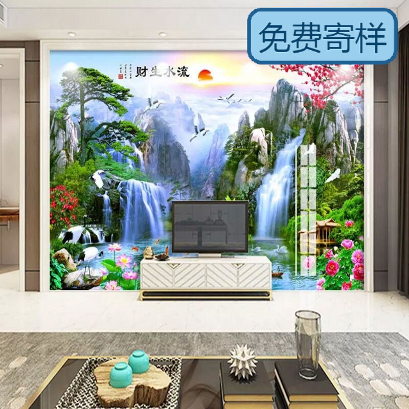 山水画流水生财电视沙发背景墙客厅壁画影视墙布背景壁布定制墙画热门设计联盟服务商