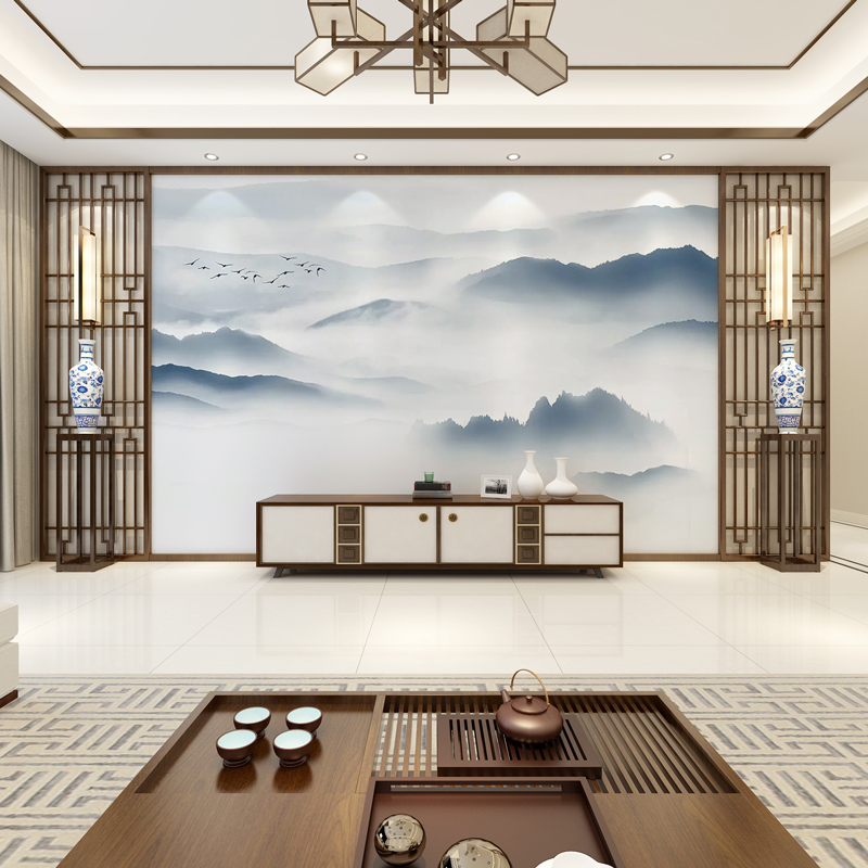现代中式水墨山水意境电视背景墙壁纸沙发茶室墙纸壁布影视墙壁画热门设计联盟服务商