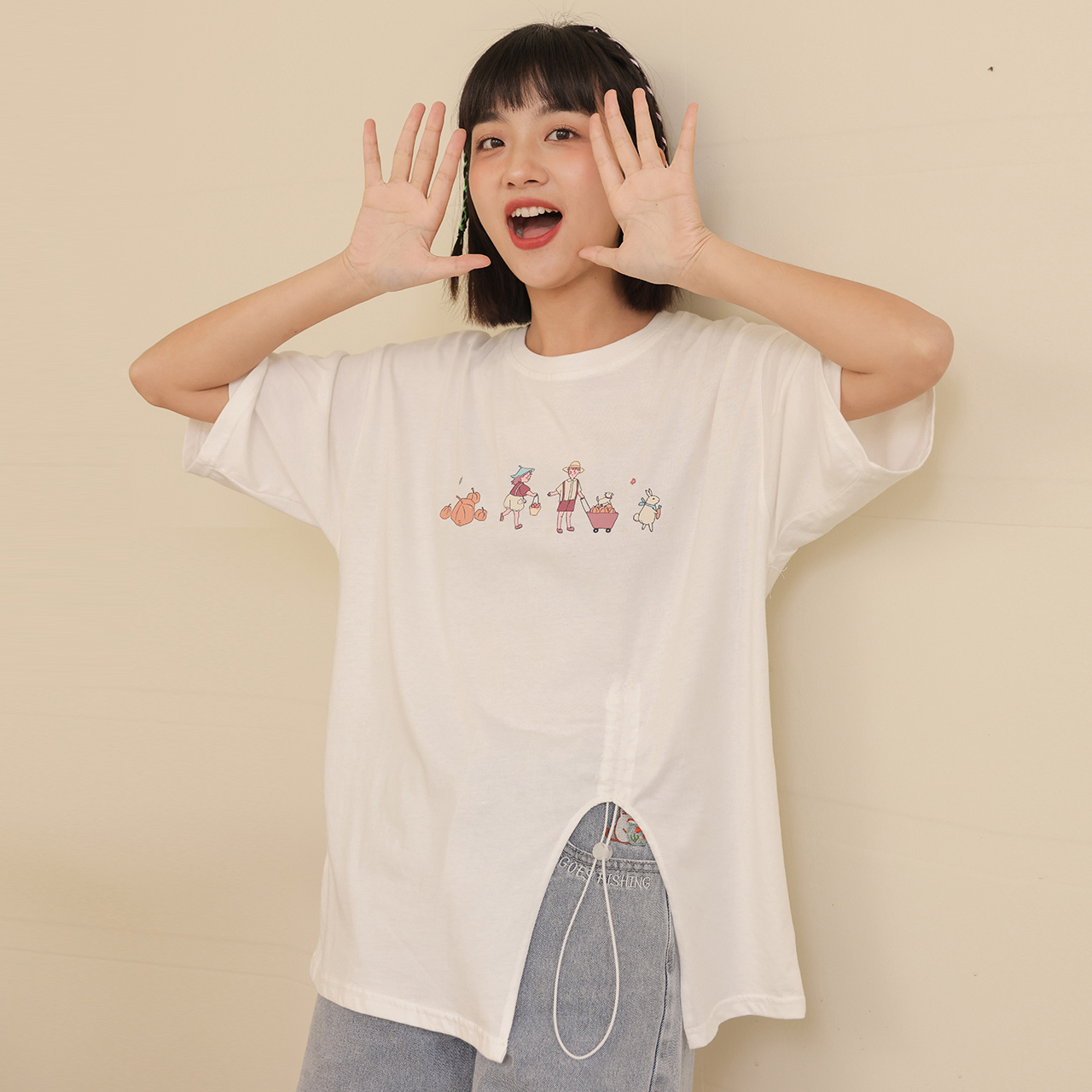 禾萍漫画印花抽绳开叉t恤女夏设计感小众2021年新款宽松短袖上衣热门设计联盟服务商