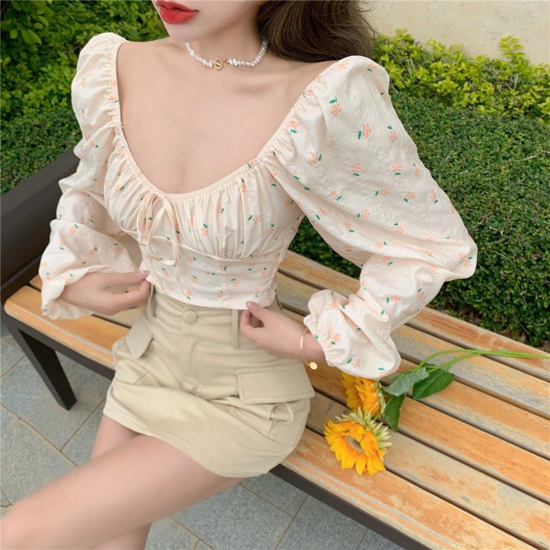 chic港味复古短款系带显瘦碎花衬衫女设计感小众一字肩网红上衣潮热门设计联盟服务商