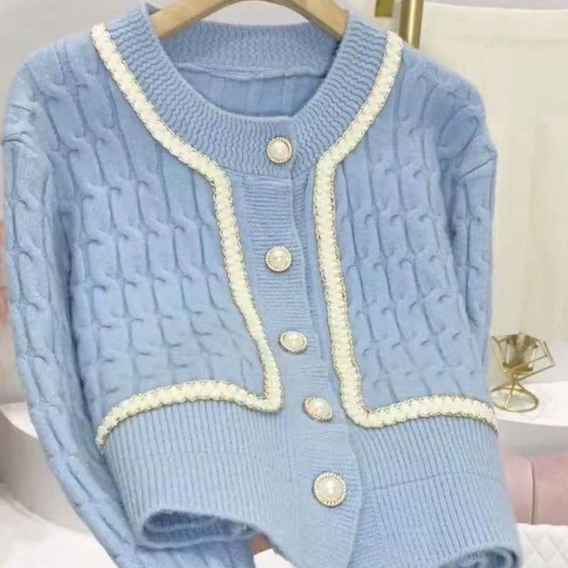 网红款蓝色小香风短款外套2021秋冬新款麻花毛衣女圆领针织开衫热门设计联盟服务商