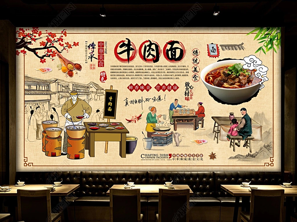 定制复古怀旧手绘牛肉面面馆饭店装饰背景墙海报宣传画油画布热门设计联盟服务商