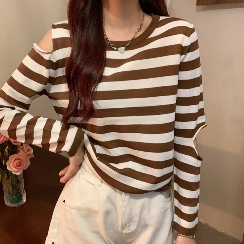 条纹宽松长袖t恤女2021年春秋薄款设计感镂空打底衫内搭洋气上衣热门设计联盟服务商