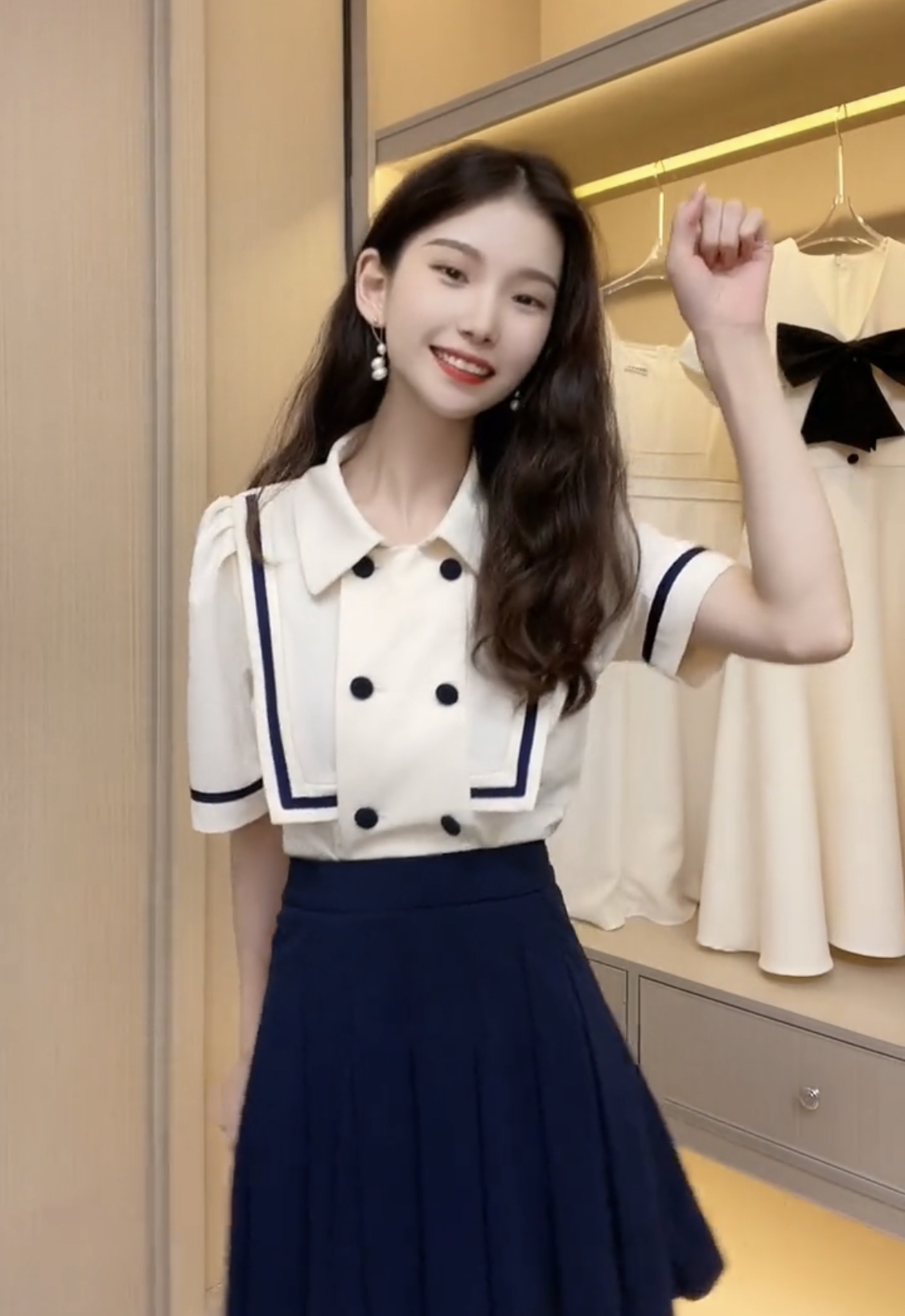 法式名媛小香风气质小众设计感夏季polo领撞色衬衫高腰百褶裙套装热门设计联盟服务商