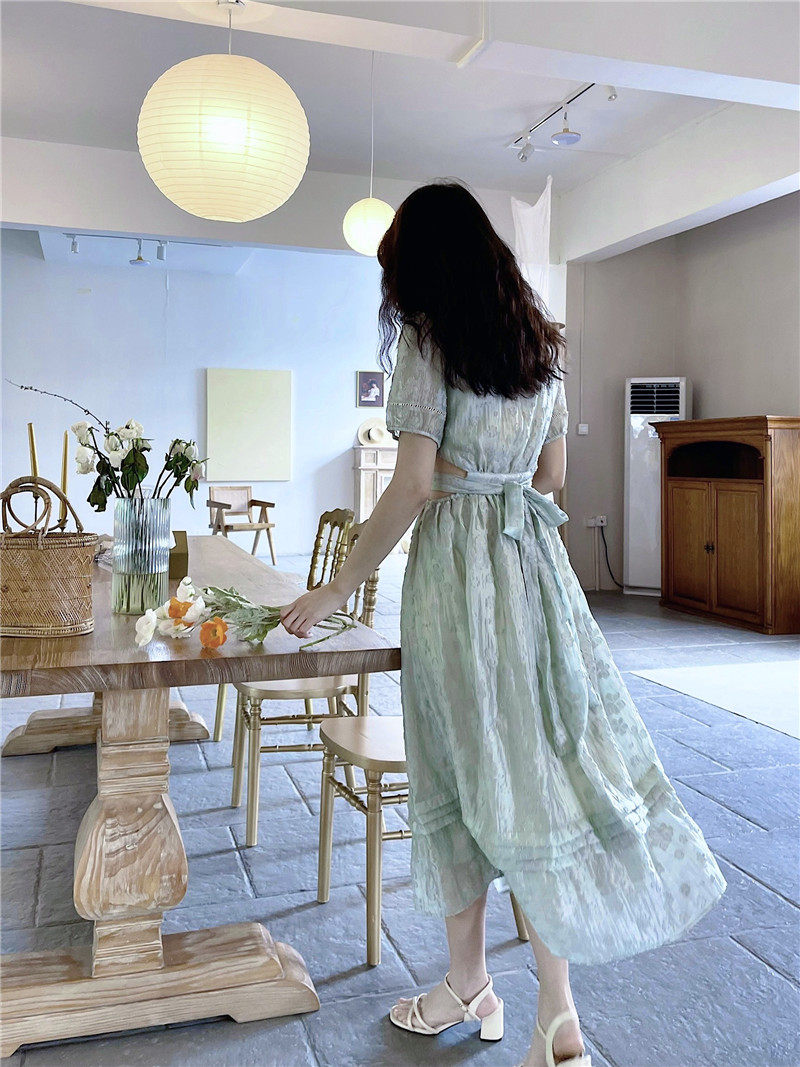 法式复古文艺少女方领提花连衣裙2021夏设计感露腰收腰显瘦中长裙热门设计联盟服务商